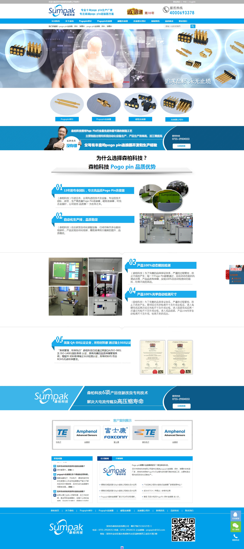 Project Description 深圳市森柏科技有限公司是专注高端pogo pin连接器、探针、弹簧针的制造厂家,森柏科技拥有Pogo Pin行业最先进和最可靠的制造工艺,主要制造过程均实现自动化设备生产,产品生产效率高,加工精度高,重要检测过程均采用自动化快速识别系统,大大降低了人为操作失误的风险,极大的提升了检测效率,工艺过程得到极大的改善和满足。因此产品质量和稳定性获得巨大突破。 Official website address 重庆http://www.zgsumpak.com I want to share